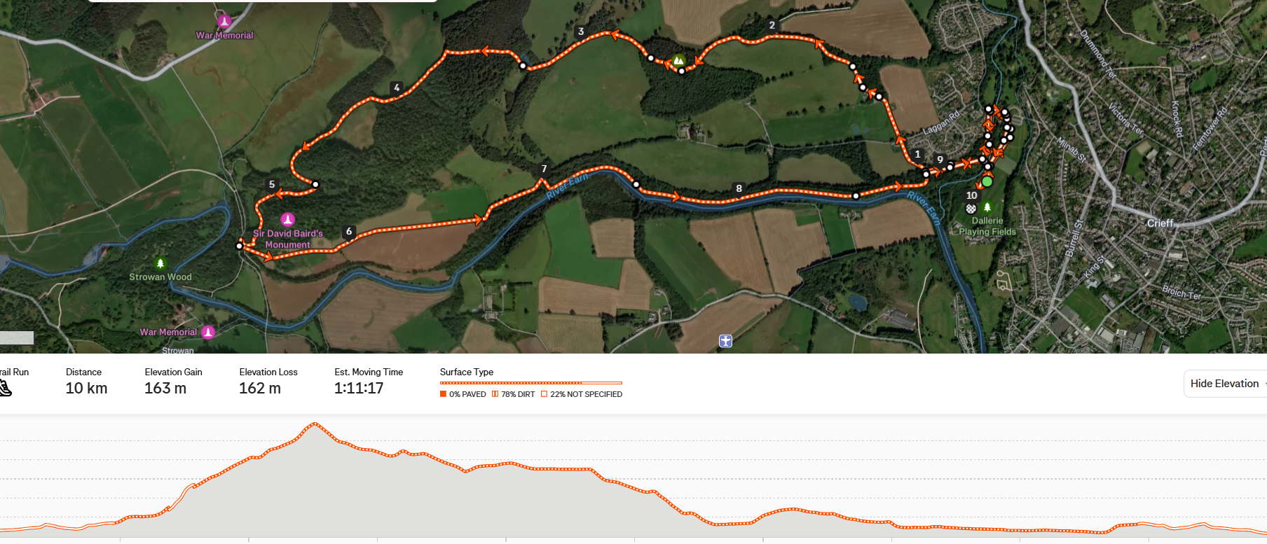 The Crieff 10k is an event offered under a Scottish Athletics permit. It is a trail race run over a scenic route with 220m total ascent, starting from Morrison’s Academy sports ground (Dallerie). The course goes out over Laggan Hill past the Baird Monument and back along the banks of the River Earn via Lady Mary's Walk. New course for 2026 to follow the new trail from Turret Burn. Course Map